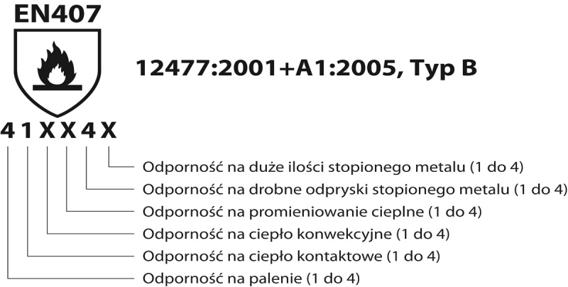 zgodność z normami EN 388:2016+A1:2018 (3121X), EN 407:2004 (41XX4X), EN ISO 21420:2020, EN 12477:2001+A1:2005, Typ B
