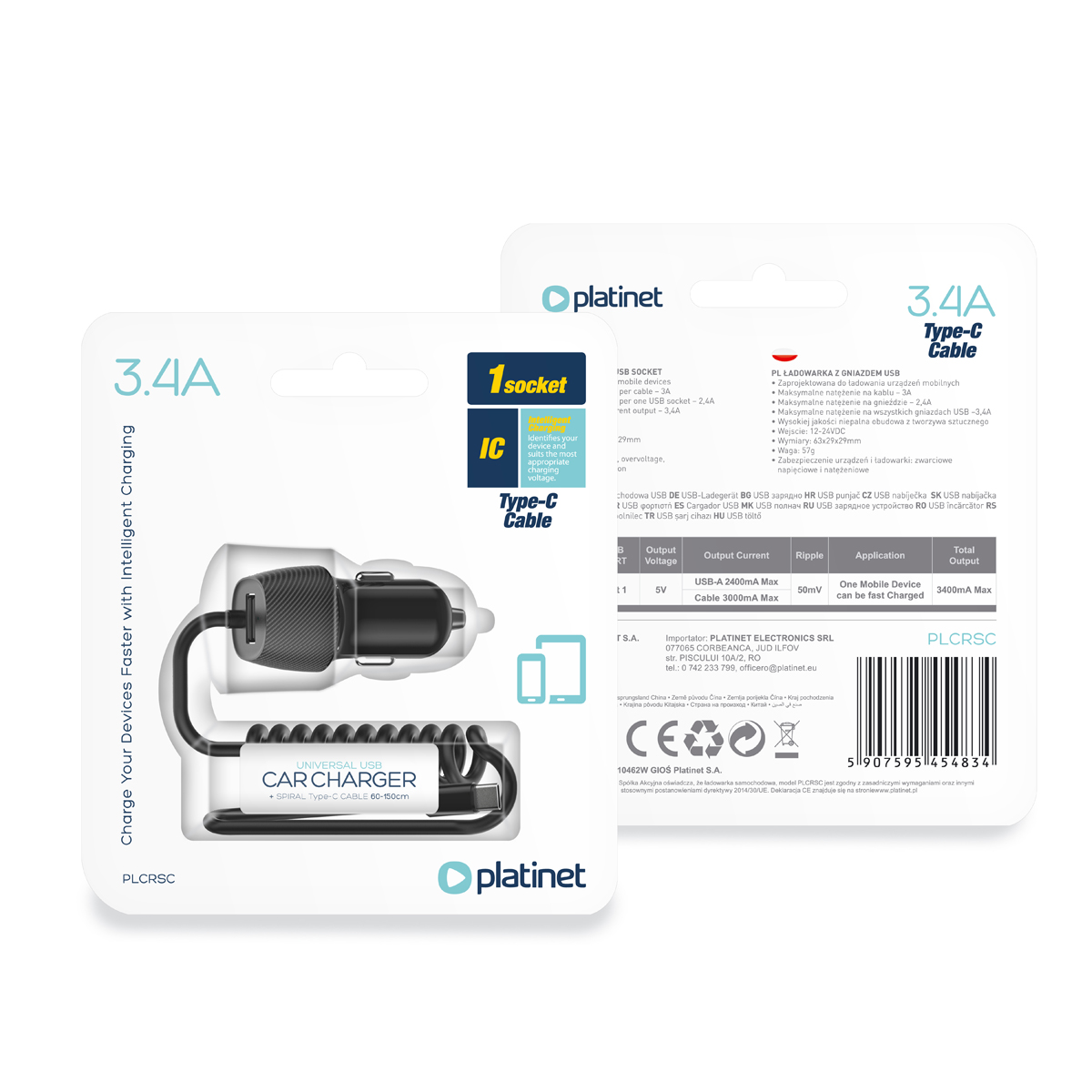 Ładowarka samochodowa USB-A 3,4A + kabel USB-C 15W PLATINET SPIRAL czarna (45483)